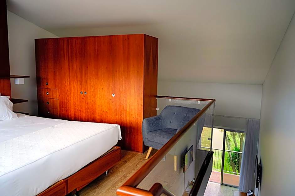 The Duplex Apartment is composed of a bedroom with either two single beds or one queen-size bed on the upper floor, and a living room and fully equipped kitchenette on the lower floor. It includes a private bathroom. It also features a patio with partial sea view.